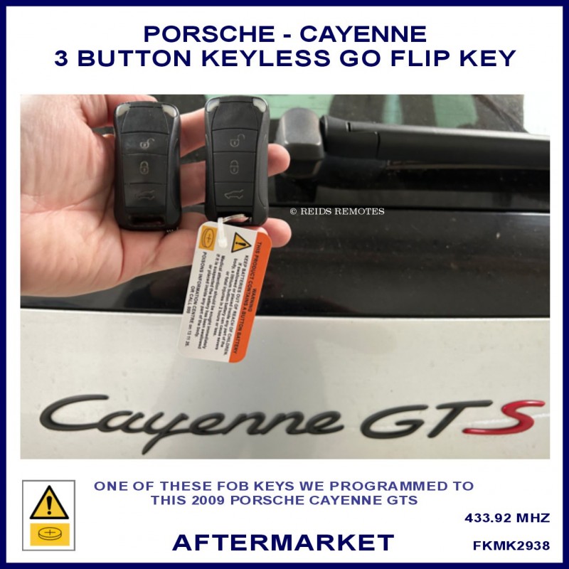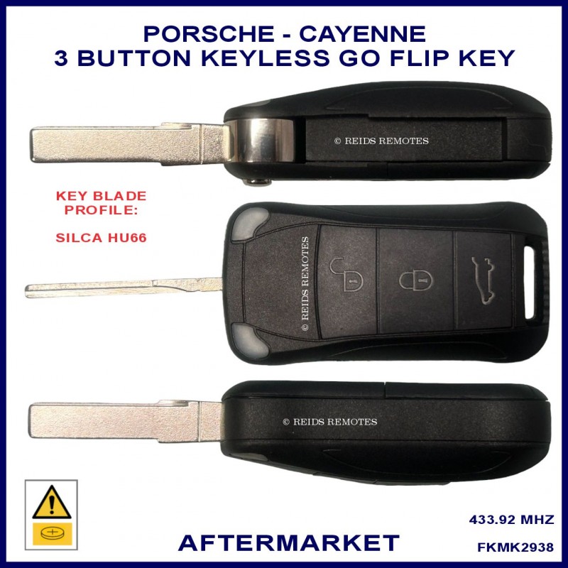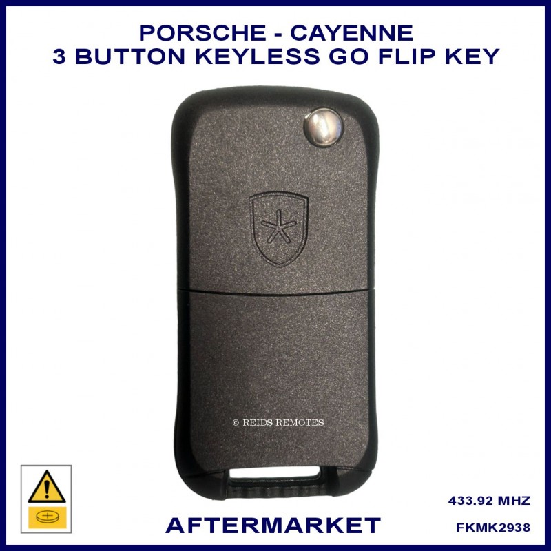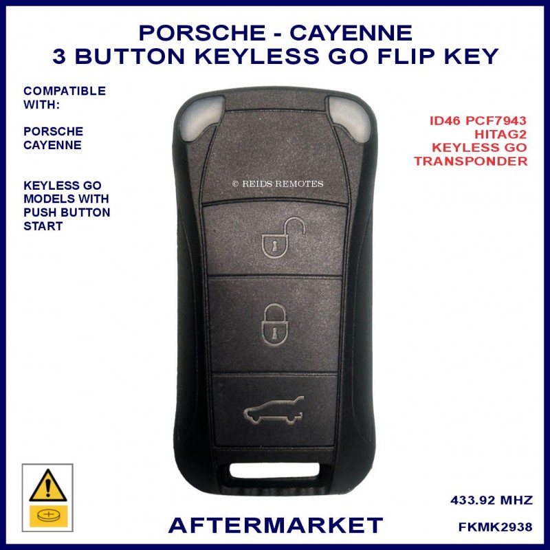 This high quality aftermarket 3 button Keyless Go proximity remote flip key suits selected Porsche Cayenne models unising an identical key with the same PCF7943 transponder chip.