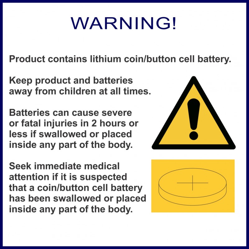 WARNING! KEEP BATTERIES OUT OF REACH OF CHILDREN. Never allow children to replace button batteries on any device. Swallowing or placing a button cell battery inside any part of the body may lead to severe or fatal injuries in as little as 2 hours or less due to chemical burns and potential perforation of the oesophagus.