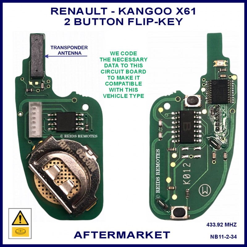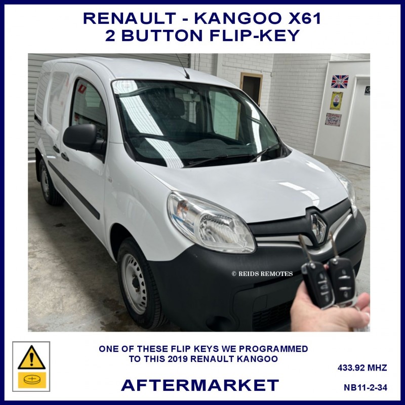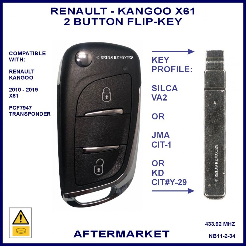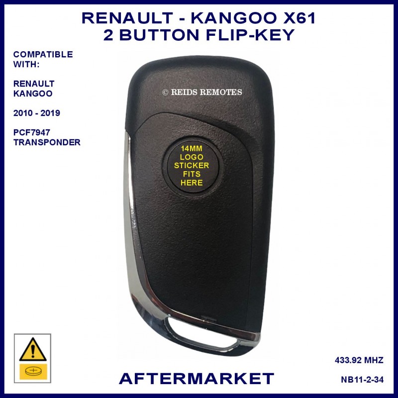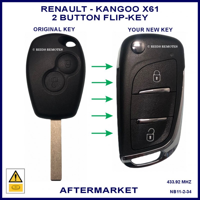 Renault Kangoo models from 2010 - 2019 compatible aftermarket 2 button flip key which can be used to replace the 2 button black plastic original remote keys.