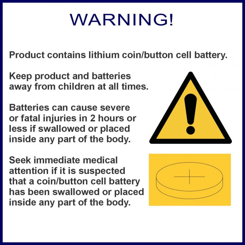 WARNING! KEEP BATTERIES OUT OF REACH OF CHILDREN. Never allow children to replace button batteries on any device. Swallowing or placing a button cell battery inside any part of the body may lead to severe or fatal injuries in as little as 2 hours or less due to chemical burns and potential perforation of the oesophagus.