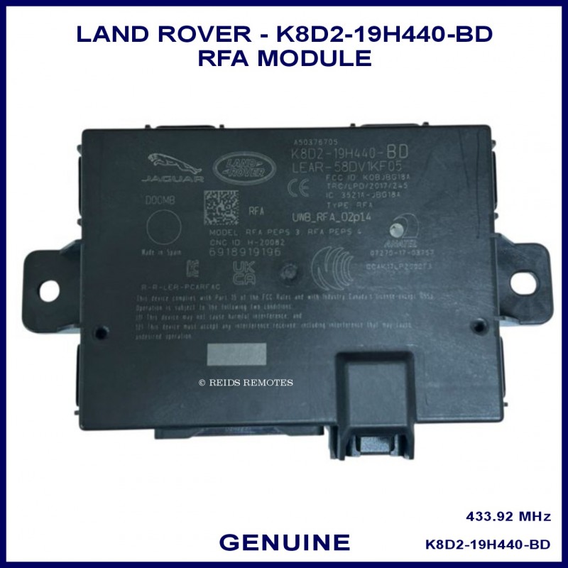 Genuine Land Rover replacement K8D2-19H440-BD RFA module for use with models after 2018 with a locked PEPS type RFA when additional keys are needed.