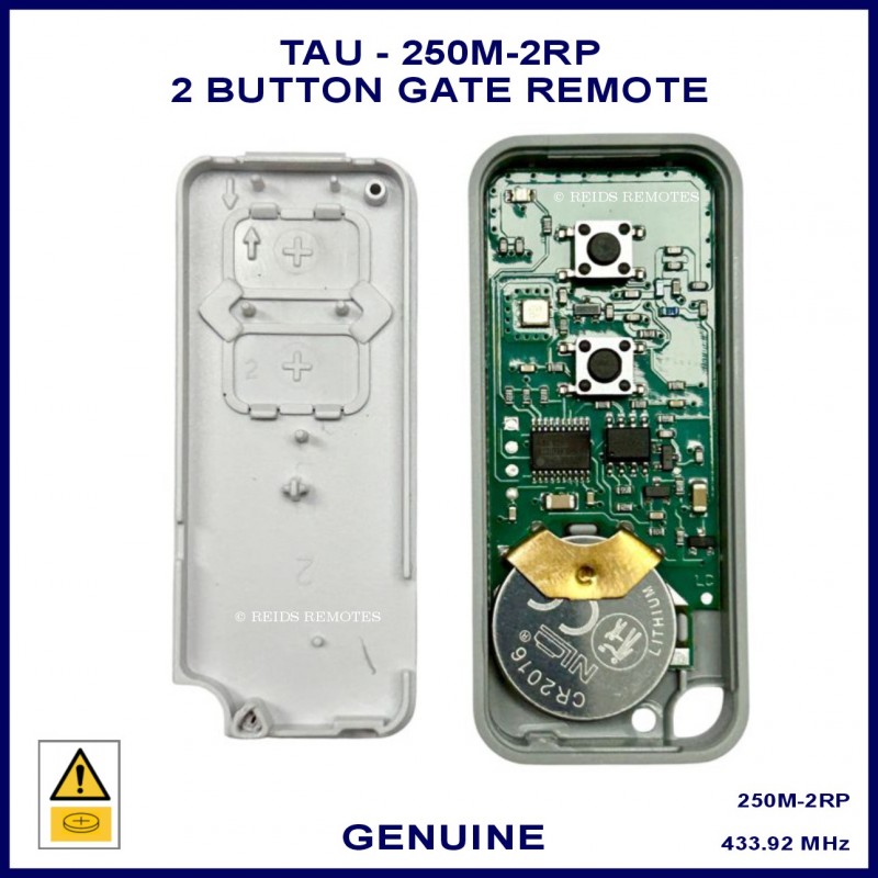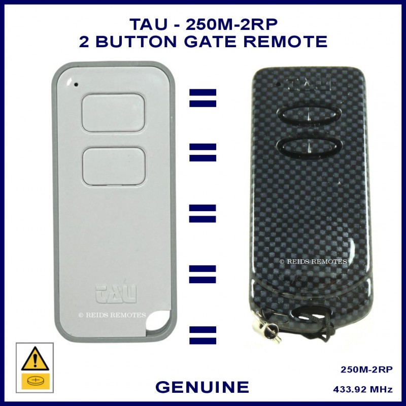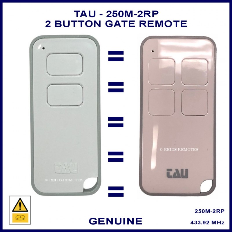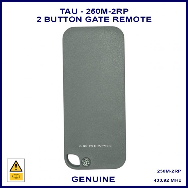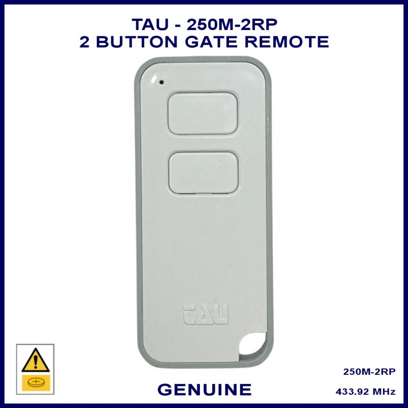 The TAU 250M-2RP remote is a rolling code 2 button remote with white & grey case.